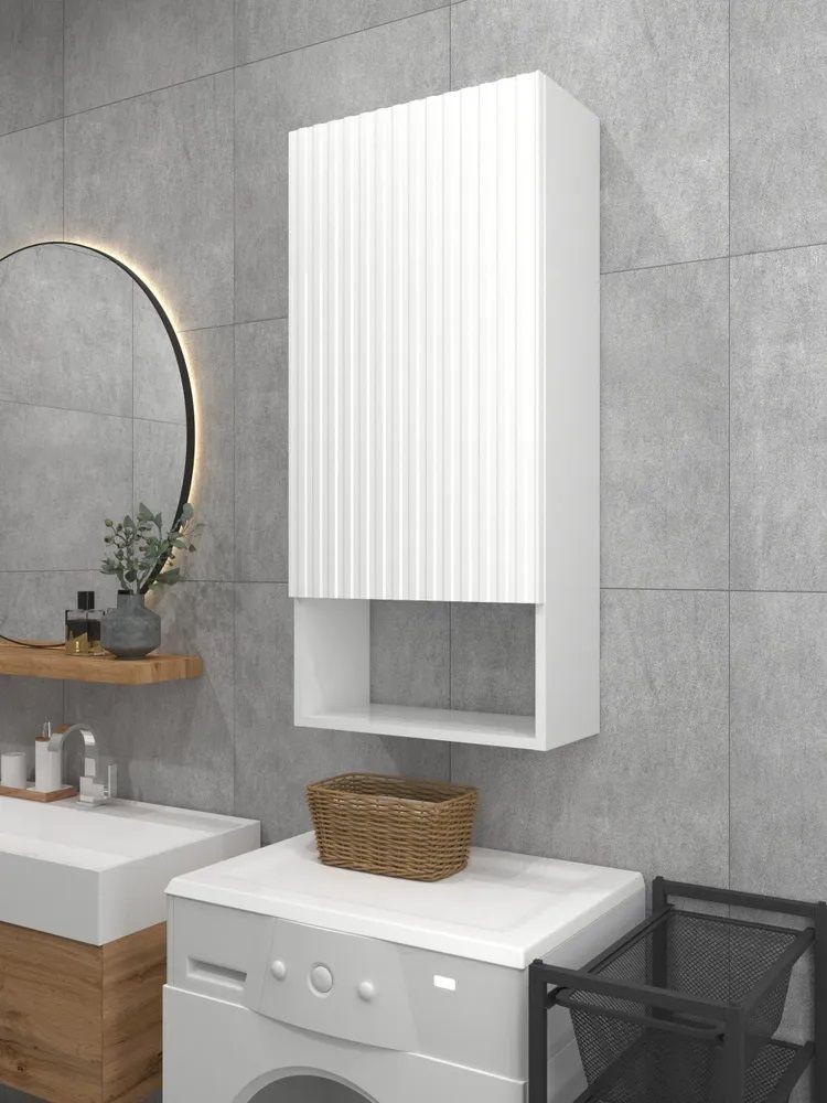 Белый шкаф с рифлёным фасадом будет отлично и стильно смотреться как в ванной, так и в туалете.